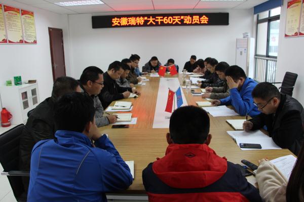 為了進一步激發(fā)廣大員工的工作熱情,促進四季度和全年經濟目標任務的完成,11月15日下午,安徽瑞特在二樓會議室召開了“大干60”動員會。會議由安徽瑞特副經理李國好主持,公司領導班子、各部門負責人及營銷全體人員參會。