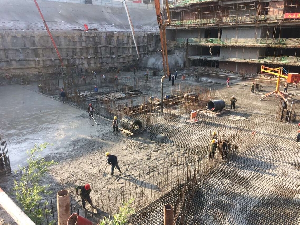 在清脆且規(guī)律的泵送聲伴奏下,一方又一方混凝土按照項(xiàng)目的要求注入指定區(qū)域,蚌埠建材主要領(lǐng)導(dǎo)深入澆筑一線,實(shí)地指導(dǎo)澆筑工作,并慰問(wèn)所有生產(chǎn)參與人員;質(zhì)量管理人員也按照預(yù)定澆筑方案對(duì)各種原材料實(shí)施定期檢測(cè),并對(duì)不同時(shí)段的入場(chǎng)混凝土進(jìn)行測(cè)溫記錄工作;隨著統(tǒng)計(jì)數(shù)據(jù)顯示1000 m3、2000 m3……的持續(xù)攀升,器材部門(mén)加強(qiáng)原材料調(diào)配力度,組織各種原材料有序進(jìn)場(chǎng),以保證生產(chǎn)平穩(wěn)推進(jìn);設(shè)備管理人員多頻次檢查設(shè)備運(yùn)行狀況,確保設(shè)備運(yùn)行正常。在總方量澆筑過(guò)半以后,生產(chǎn)人員結(jié)合現(xiàn)場(chǎng)實(shí)際情況,與項(xiàng)目管理人員充分溝通,針對(duì)現(xiàn)場(chǎng)道路的客觀因素,將第四臺(tái)備用泵送設(shè)備及時(shí)調(diào)配到位,干脆利索的完成一次時(shí)間差,確保近三千平方澆筑面積全覆蓋,避免出現(xiàn)冷縫這一惡性質(zhì)量事故的發(fā)生,此項(xiàng)舉措獲得了項(xiàng)目的高度評(píng)價(jià),4月28當(dāng)天也創(chuàng)下了單日4488 m3的歷史最高澆筑記錄。