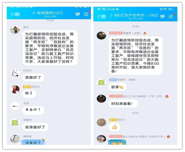 `活動于3月13日晚上7點30分,率先以小規(guī)模答題模式在蚌埠建材團支部QQ群(33人)進行;并于晚上8點整,同時在蚌埠建材黨員之家QQ群(25人)、蚌埠建材QQ群(107人)、BBJC生產(chǎn)合作伙伴QQ群(182人),進行全面開花式線上搶答活動。