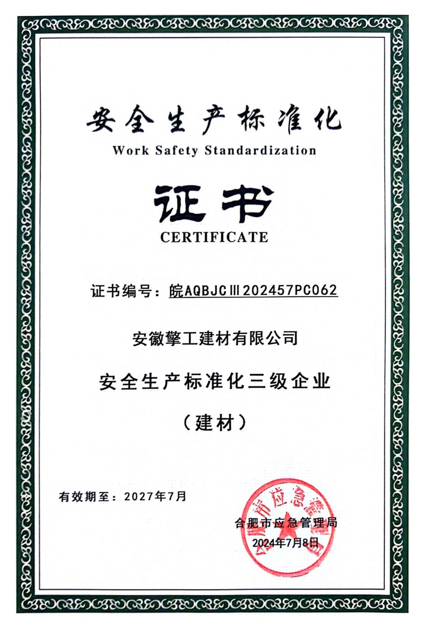2024年7月8日,安徽擎工建材有限公司取得合肥市應(yīng)急管理局頒發(fā)的“安全生產(chǎn)標(biāo)準(zhǔn)化三級企業(yè)(建材)”證書,標(biāo)志著擎工建材公司的安全生產(chǎn)管理水平和市場競爭力邁上了新臺階。