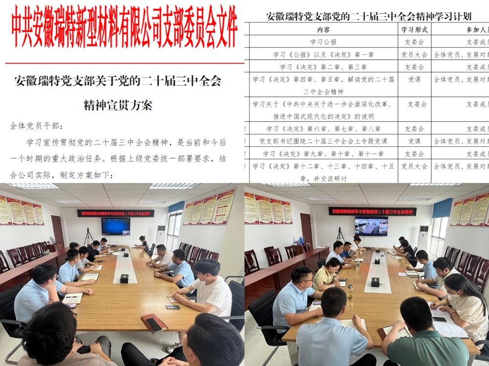 安徽瑞特為深入貫徹落實黨的二十屆三中全會精神,進一步落實上級黨委各項重要決策部署,近日來,黨支部多措并舉,迅速掀起學(xué)習(xí)宣傳貫徹全會精神的熱潮,準(zhǔn)確把握進一步全面深化改革的重大舉措,做到學(xué)深悟透,入腦入心,努力在公司高質(zhì)量發(fā)展新征程上展現(xiàn)新作為。