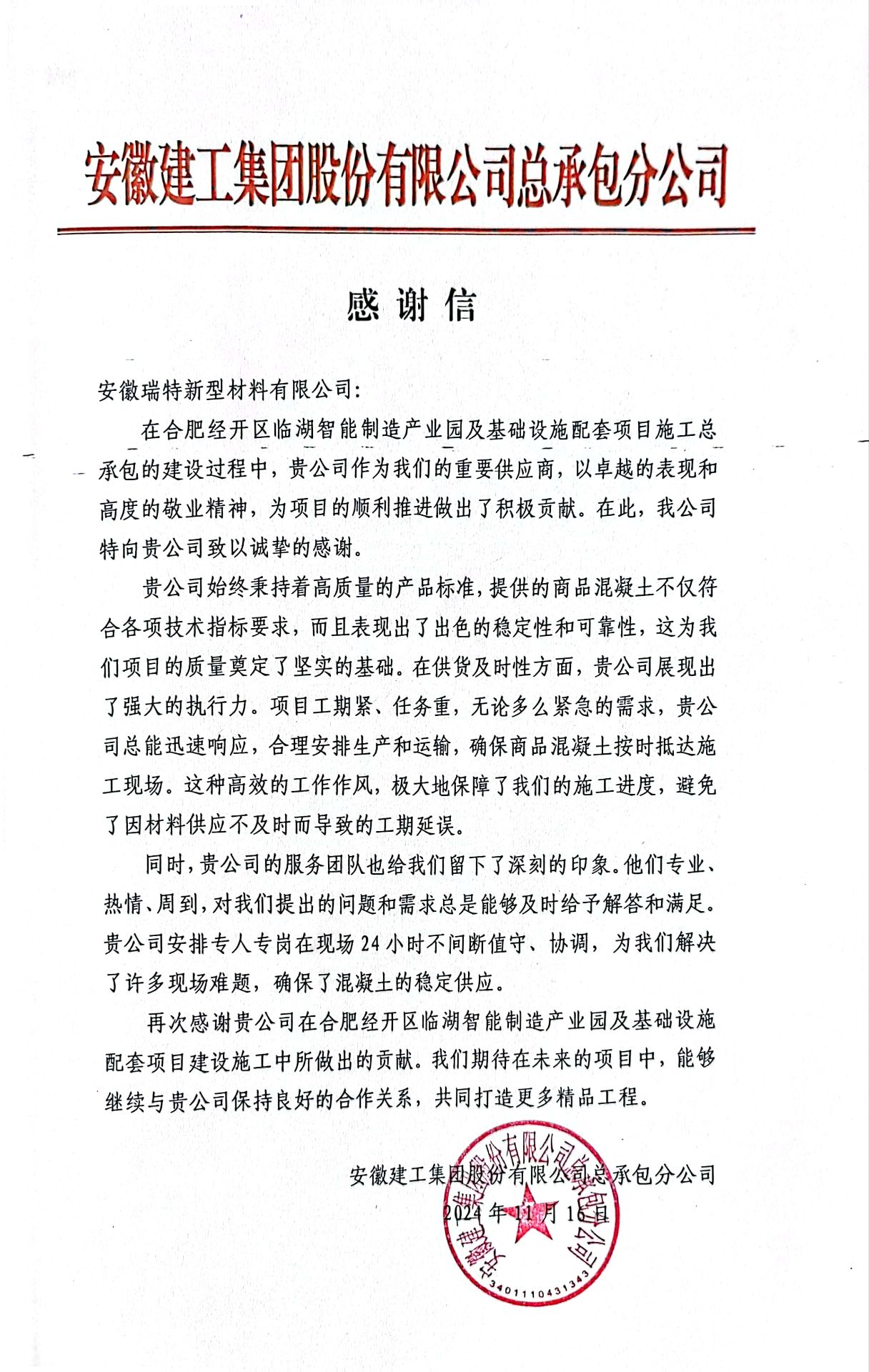 喜訊!安徽瑞特收到總承包大眾產(chǎn)業(yè)園項目感謝信