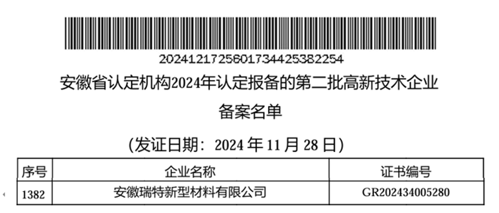 12月17日,國家高新技術(shù)企業(yè)認(rèn)定管理工作網(wǎng)發(fā)布《對安徽省認(rèn)定機(jī)構(gòu)2024年認(rèn)定報(bào)備的第二批高新技術(shù)企業(yè)進(jìn)行備案的公告》,建工建材安徽瑞特公司名列其中,成功獲評國家“高新技術(shù)企業(yè)”。