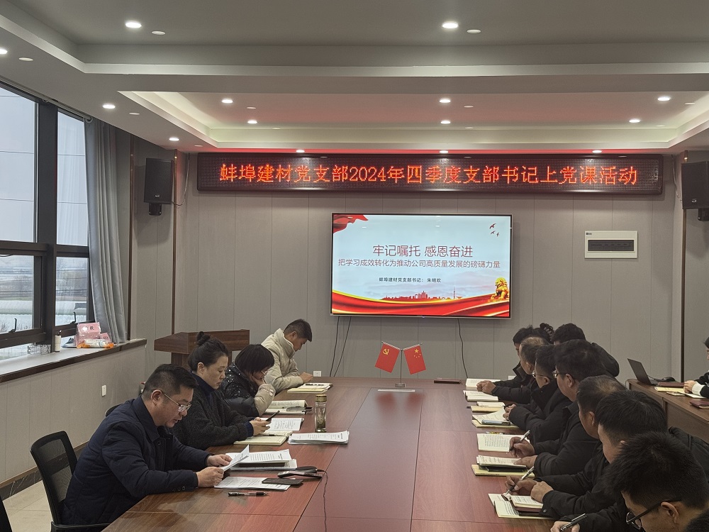 為進(jìn)一步深入學(xué)習(xí)貫徹習(xí)近平總書記考察安徽重要講話精神,凝聚改革共識(shí)、激發(fā)奮進(jìn)力量,提升支部凝聚力與戰(zhàn)斗力,引導(dǎo)黨員筑牢信仰之基、踐行初心使命、切實(shí)擔(dān)當(dāng)作為。12月23日下午,蚌埠建材組織開展了四季度支部書記上黨課活動(dòng)。公司黨支部書記、總經(jīng)理朱明歡以“牢記囑托,感恩奮進(jìn),將學(xué)習(xí)成效轉(zhuǎn)化為推動(dòng)公司高質(zhì)量發(fā)展的磅礴力量”為主題,為全體黨員、積極分子、發(fā)展對(duì)象講授了一堂內(nèi)容詳實(shí)、形象生動(dòng)的黨課。