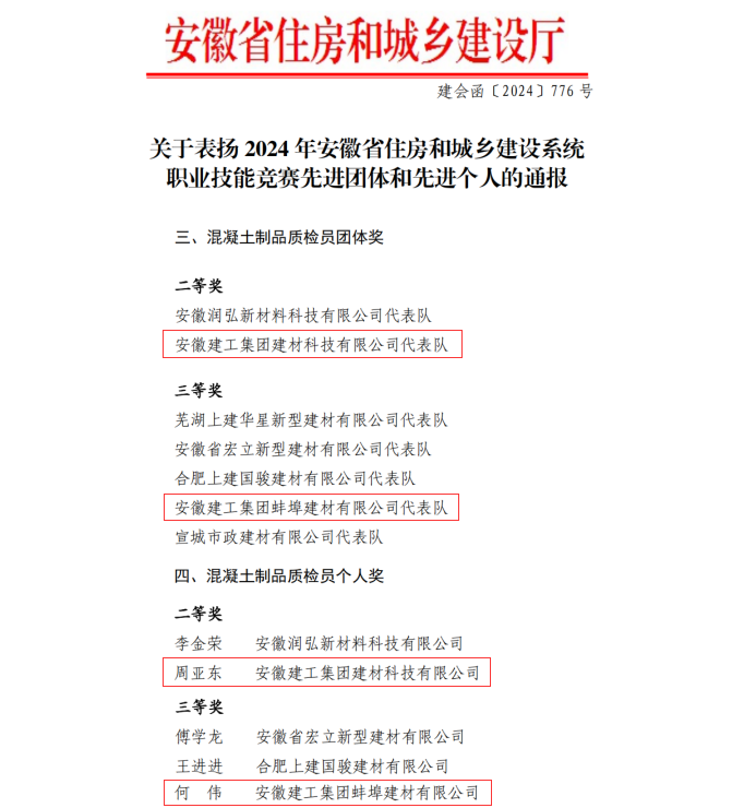 近日,由安徽省住房和城鄉(xiāng)建設廳主辦的2024年安徽省住房和城鄉(xiāng)建設系統(tǒng)職業(yè)技能競賽——混凝土制品質(zhì)檢員競賽成績公布。建工建材代表隊和建工蚌埠建材代表隊分別榮獲團體獎二等獎和三等獎,周亞東、何偉分別獲得個人二等獎和三等獎。