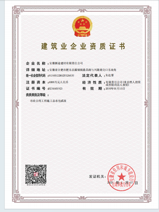 2025年1月15日,安徽新途建材有限責任公司喜獲安徽省住房和城鄉(xiāng)建設(shè)廳正式批準,市政公用工程施工總承包二級資質(zhì)順利通過審核。標志著新途建材在市政公用工程領(lǐng)域邁上了新的臺階,市場競爭力得到顯著提升,為公司的業(yè)務(wù)范圍拓展奠定了堅實的基礎(chǔ)。