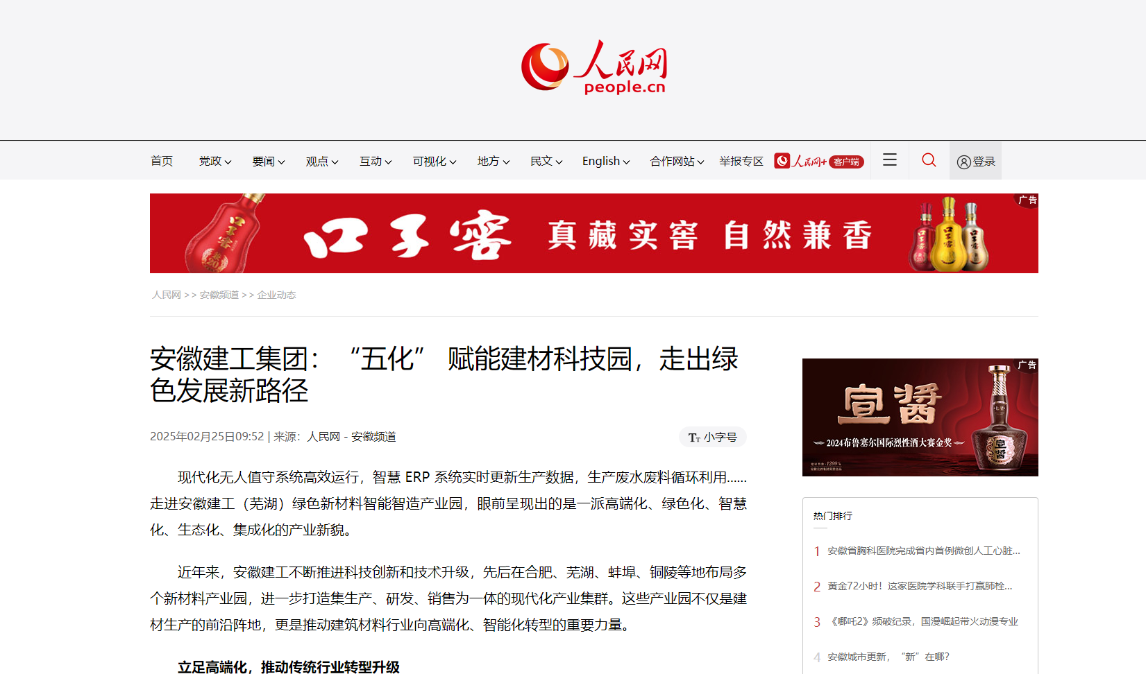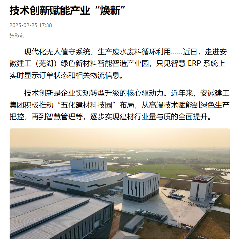 近日,人民網(wǎng)、安徽日報等多家媒體聚焦建工建材“五化”科技園布點工作,引發(fā)廣泛關(guān)注。