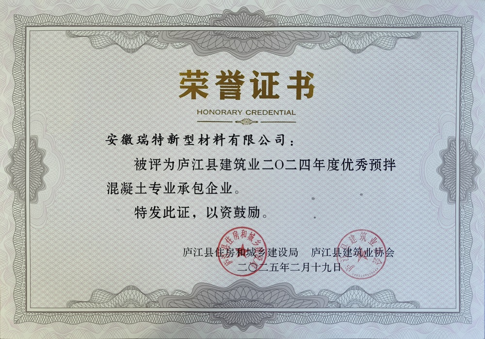安徽瑞特新型材料有限公司,憑借其在技術(shù)創(chuàng)新、綠色發(fā)展和社會(huì)責(zé)任等領(lǐng)域的卓越成就,再次榮獲“廬江縣建筑業(yè)2024年度優(yōu)秀預(yù)拌混凝土專(zhuān)業(yè)承包企業(yè)”殊榮。