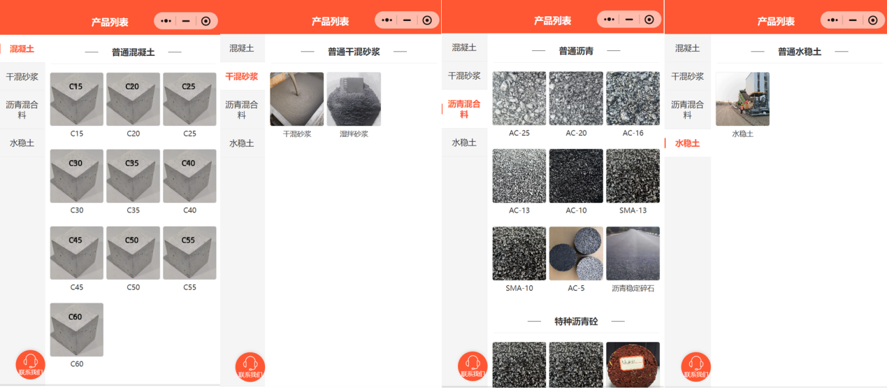 產(chǎn)品列表方面整合了建工建材11家站點(diǎn)生產(chǎn)資源,包括混凝土、干混砂漿、瀝青混合料、水穩(wěn)土共計(jì)38種產(chǎn)品,全方位展示了我司全面的生產(chǎn)能力與實(shí)力!