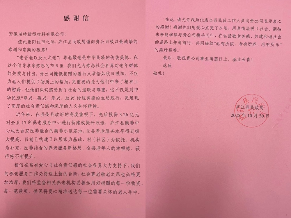 近日,安徽建工瑞特新材料科技有限公司收到來自廬江縣民政局的感謝信,對(duì)我司在重陽(yáng)佳節(jié)期間開展的愛心敬老行動(dòng)予以表彰和高度肯定。