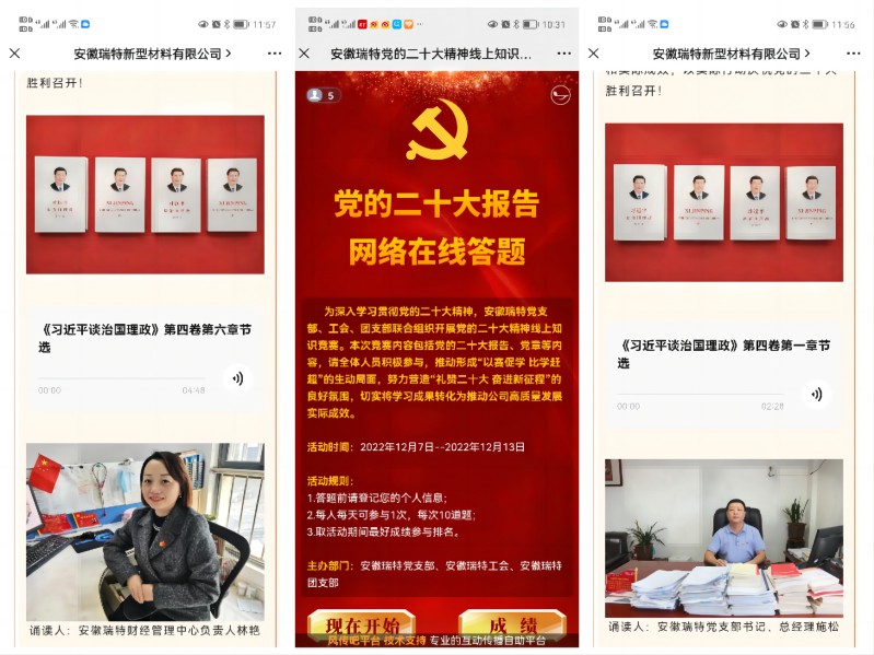 自黨的二十大會(huì)議召開以來,安徽瑞特黨支部迅速掀起學(xué)習(xí)熱潮,堅(jiān)持系統(tǒng)謀劃,學(xué)用結(jié)合,廣泛組織各種學(xué)習(xí)宣貫活動(dòng),持續(xù)推動(dòng)學(xué)習(xí)黨的二十大精神走深走實(shí),讓黨的二十大精神入腦入心,切實(shí)將學(xué)習(xí)成果轉(zhuǎn)化為干事創(chuàng)業(yè)的生動(dòng)實(shí)踐,助力安徽瑞特高質(zhì)量轉(zhuǎn)型升級。