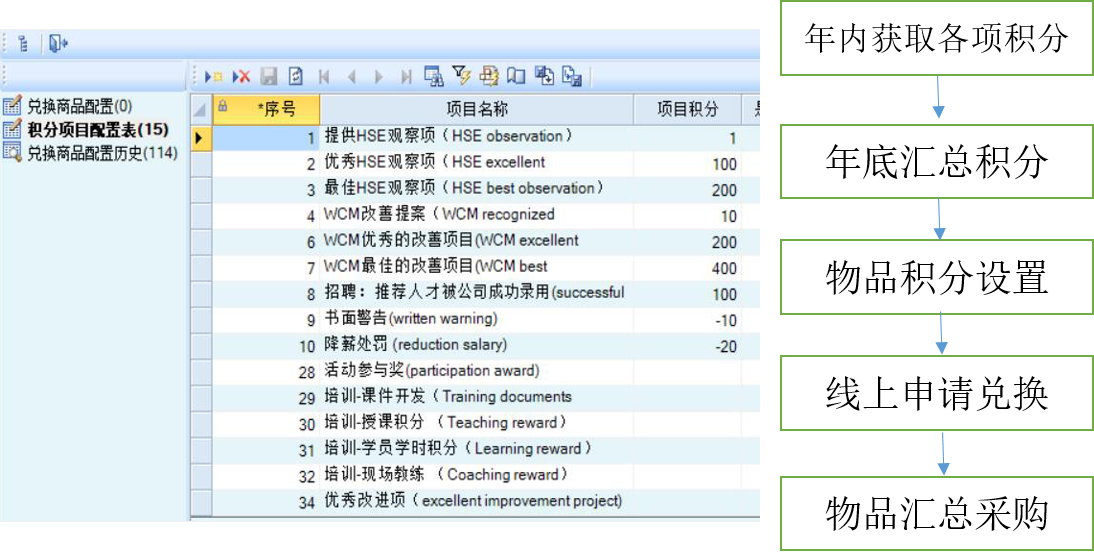 積分兌換:員工一年里根據(jù)各項規(guī)定(如HSE觀察項,WCM提案,招聘推薦,公司獎懲,培訓得分等)可得到一定數(shù)值的公司積分,年底的時候統(tǒng)一用來兌換物品;