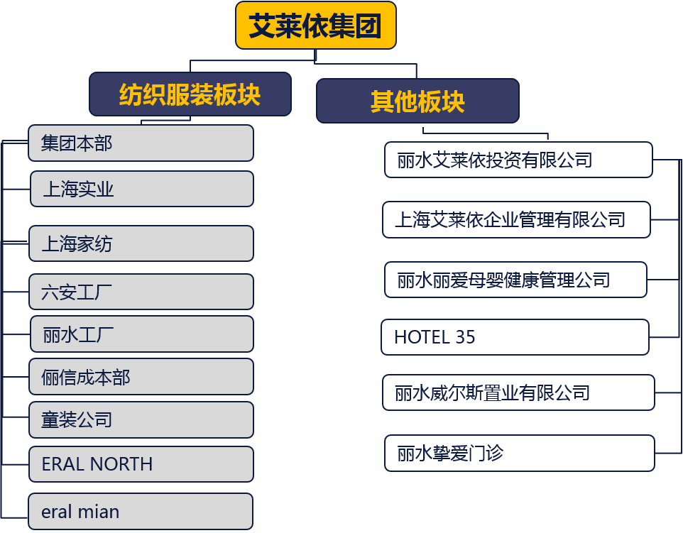 集團(tuán)活躍在時(shí)裝、家用紡織品、童裝、電子商務(wù)、服裝制造等幾大領(lǐng)域。目前呈現(xiàn)以艾萊依服裝、NICKIE童裝、艾萊依家紡、RolyQueen女裝、電子商務(wù)等多元化發(fā)展??偛吭O(shè)在浙江麗水,管理中心位于上海,生產(chǎn)基地分布在浙江麗水、安徽六安。