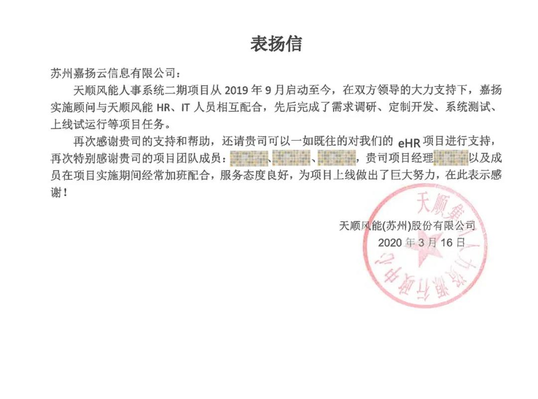 嘉揚(yáng)實(shí)施項(xiàng)目組在整個(gè)實(shí)施過(guò)程中,獲得了天順風(fēng)能e-HR項(xiàng)目組等肯定與贊許。天順風(fēng)能現(xiàn)發(fā)來(lái)表?yè)P(yáng)信,對(duì)嘉揚(yáng)實(shí)施團(tuán)隊(duì)對(duì)于項(xiàng)目所做的巨大努力,表示感謝!