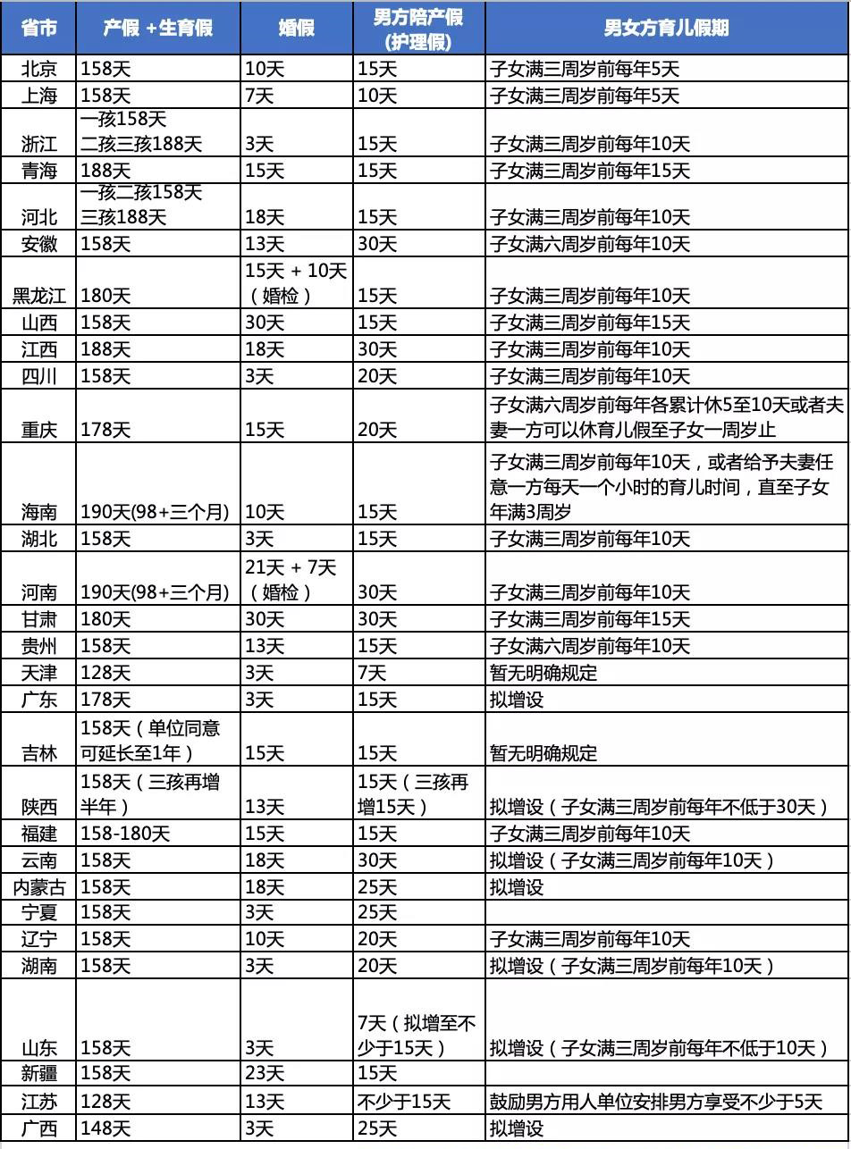 其中有不同程度對于生育相關(guān)假期 — 延長產(chǎn)假(生育假)、婚假、男方陪產(chǎn)假(護(hù)理假)、育兒假等的更新。