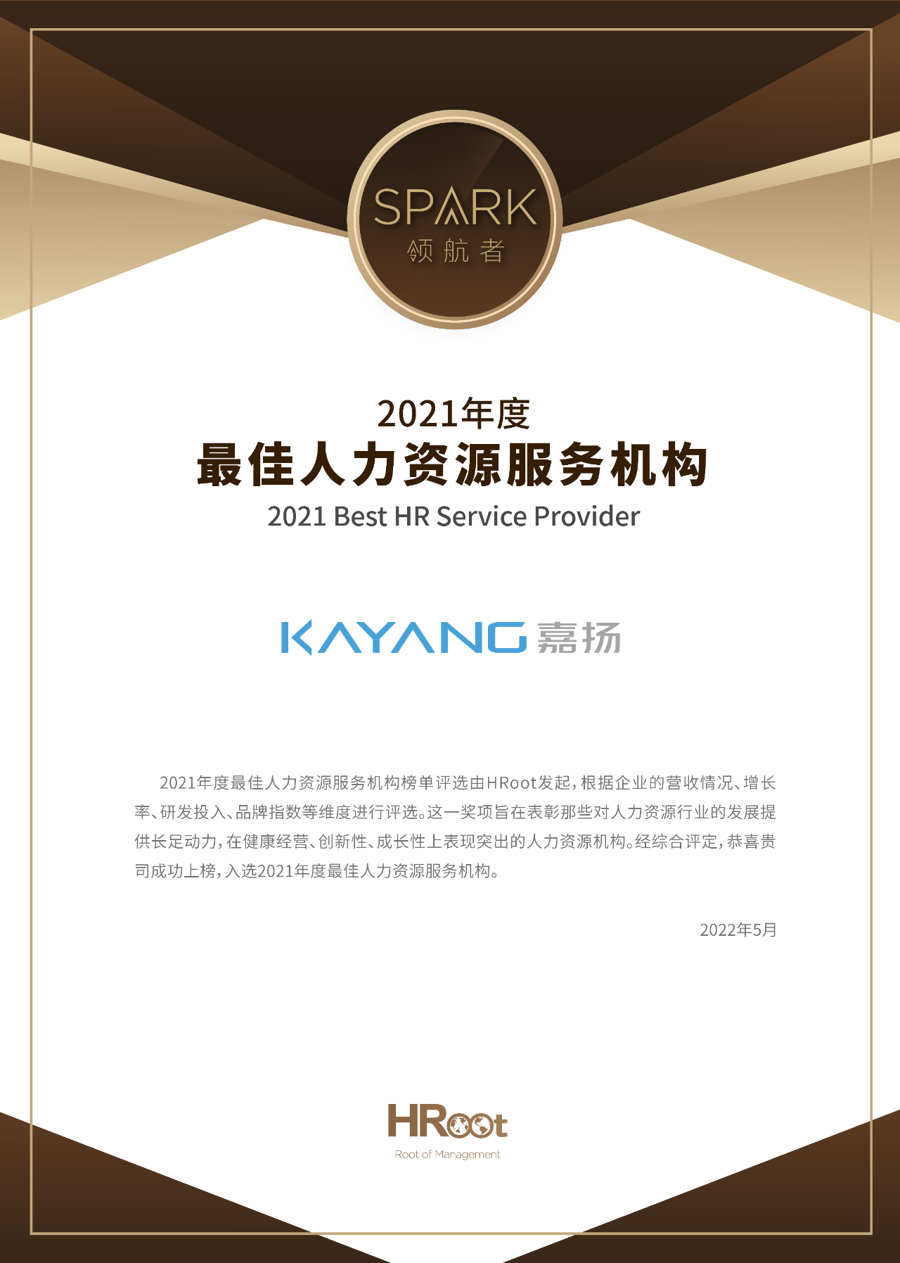 5月13日,中國領先的人力資源媒體HRoot隆重揭曉了「Spark領航者」2021年度最佳人力資源服務機構榜單,上海嘉揚信息系統(tǒng)有限公司強勢上榜,榮獲“2021年度最佳人力資源服務機構”。